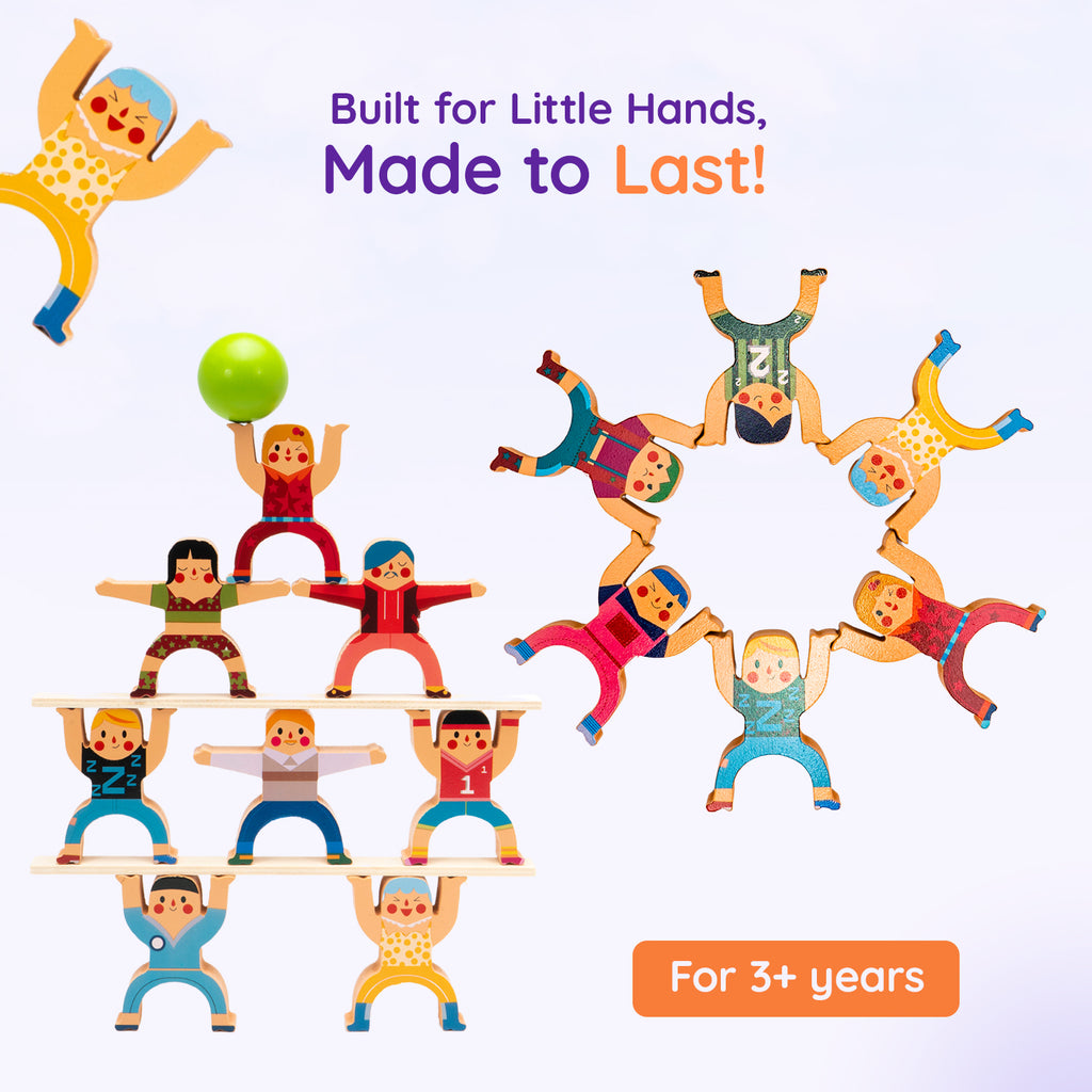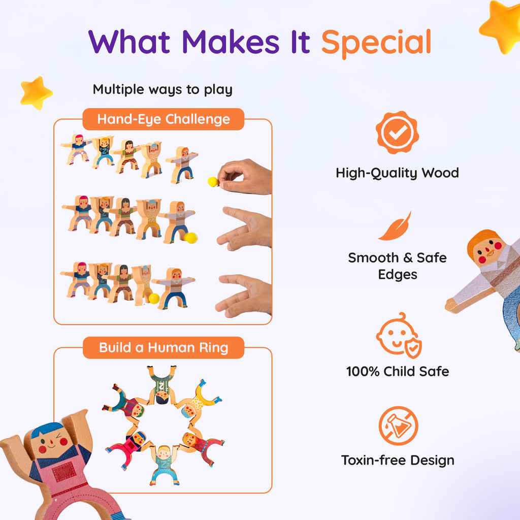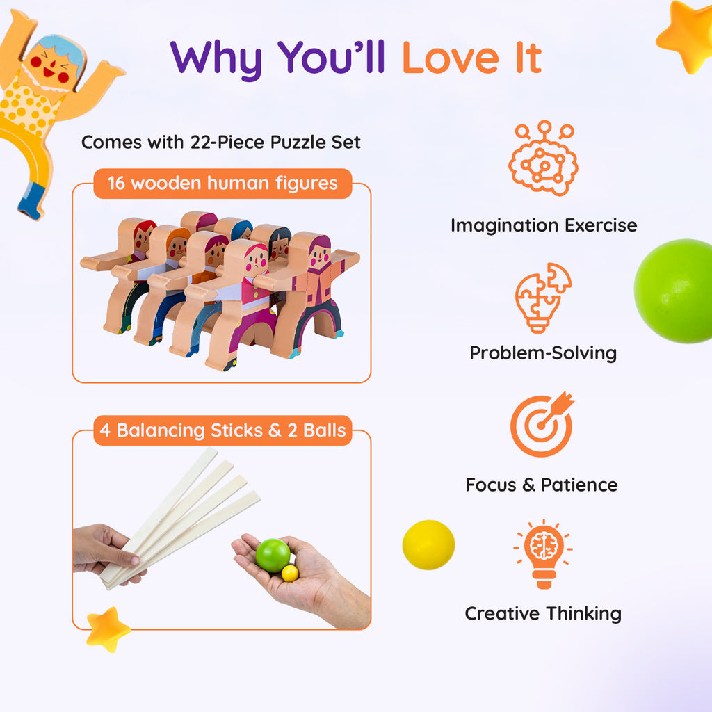 - Complete Game Set — Includes 16 wooden human figures, 4 balancing sticks, and 2 balls (small and large) for versatile play