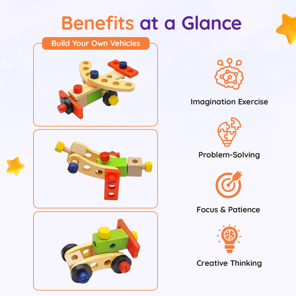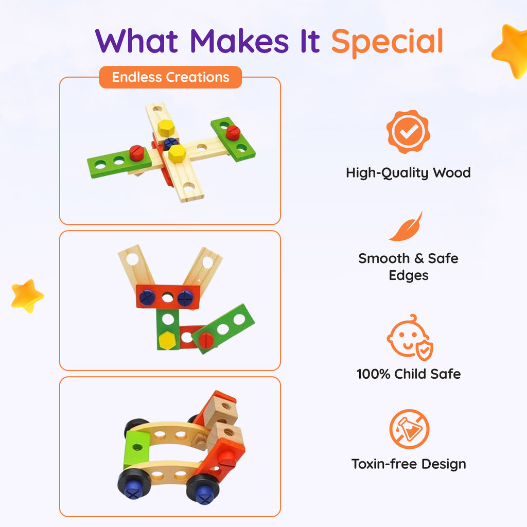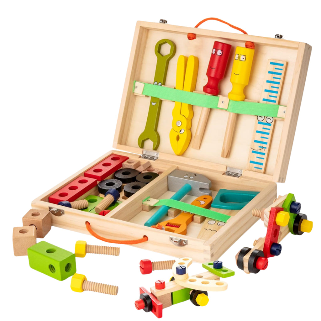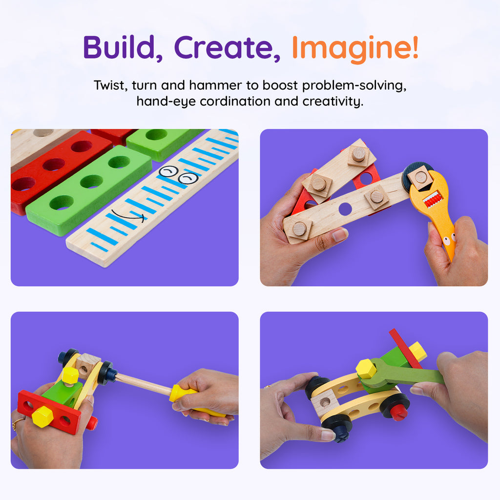 - Complete Tool Collection — Includes hammer, screwdriver, wrench, pliers, saw, nuts, bolts, and more for endless building possibilities